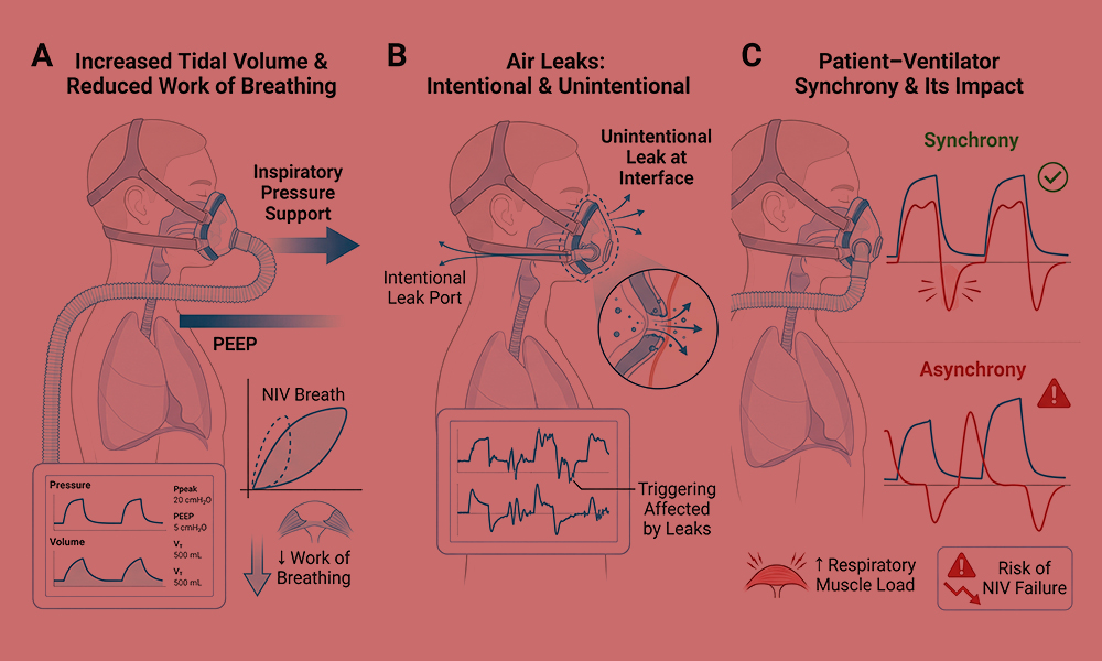 (A) Application of inspiratory pressure support and positive end-expiratory pressure (PEEP) during NIV augments tidal volume and reduces the work of breathing compared with spontaneous breathing. (B) Air leaks are inherent to NIV and may occur intentionally through leak ports or unintentionally at the interface–skin junction, influencing effective pressure delivery and ventilator triggering. (C) Patient–ventilator synchrony depends on accurate detection of patient inspiratory effort and appropriate cycling of ventilator support; poor synchrony may increase respiratory muscle load and contribute to NIV failure.